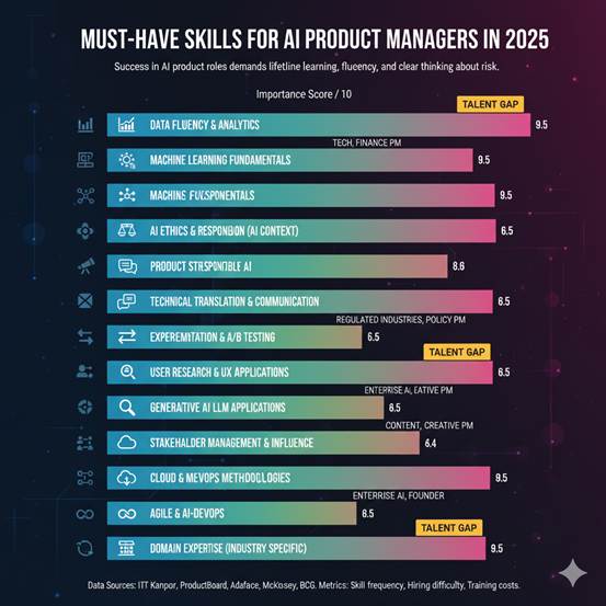 To thrive in this enviroment, PMs must embrace a blend of technical and strategic competencies. From AI & data literacy—knowing how models, training data and inference work—to product lifecycle management and agile development mastery, the modern PM is both a technologist and business leader.[6][7]